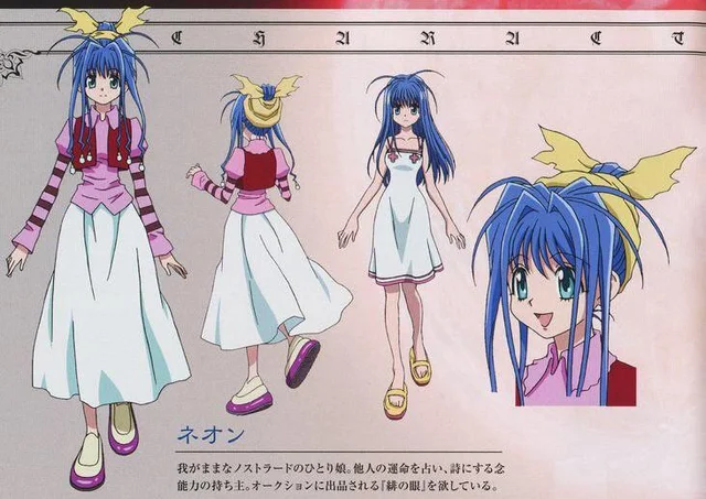Neon est de manière indirecte évoquée par Kurapika en tant qu'une des anciennes détentrices des yeux écarlates, une caractéristique rare et précieuse de son lignage.