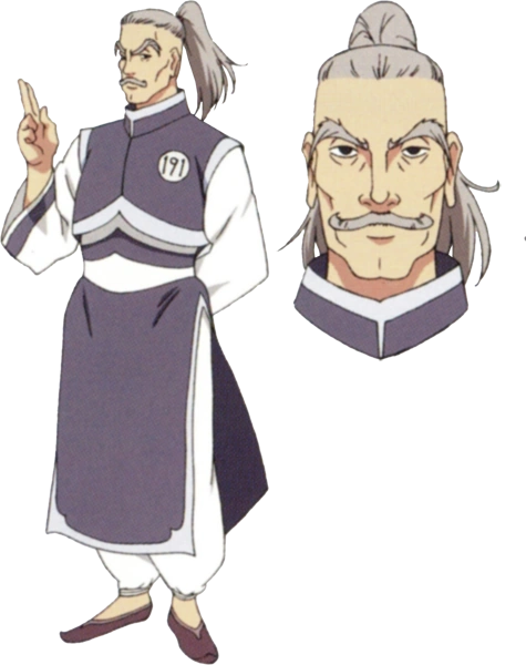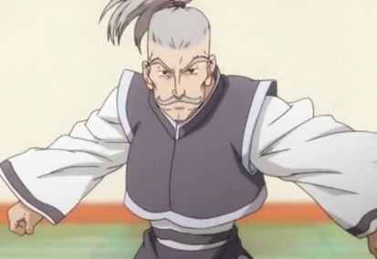 Накачанный пожилой мужчина с массивным подбородком, собирает свои длинные седые волосы в высокий хвост и носит типовую одежду восточных единоборств.