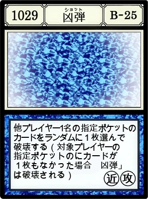 | 他プレイヤー1名の指定ポケットのカードをランダムに1枚選んで破壊する(対象プレイヤーの指定ポケットのにカードが1枚もなかった場合 凶弾」は破壊される) | |||||||