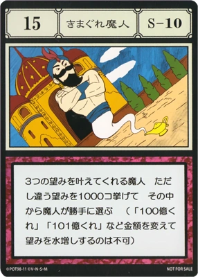 | 3つの望みを叶えてくれる魔人。ただし、違う望みを1000コ挙げて、その中から魔人が勝手に選ぶ。(「100億くれ」、「101億くれ」など、金額を変えて望みを水増しするのは不可。) | ||||