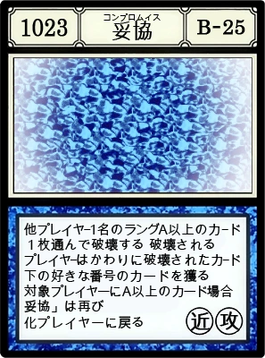 | 他プレイヤー1名のラングA以上のカード1枚通んで破壊する 破壊されるプレイヤーはかわりに破壊されたカード下の好きな番号のカードを獲る 対象プレイにA以上のカード場合 妥協」は再び化プレイヤーに戻る(指定した3ラング下のカードの限度枚数がMAXだった場合カードはもらえない) | |||||||
