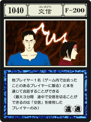 | 他プレイヤー1名(ゲーム囚で出会ったことのあるプレイヤーに限る) と本を通じて名会話することができる。(最大3分間 途中で交信を切ることができるのは[交信]を使用したプレイヤーのみ) | |||||||