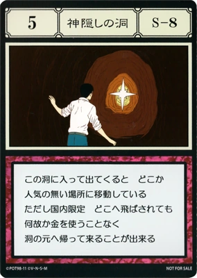 | この洞に入って出てくると、どこか人気のない場所に移動している。ただし国内限定。どこへ飛ばされても、何故か金を使うことなく洞へ帰って来ることが出来る。 | ||||