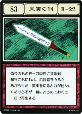 | 偽りのものを一刀両断にする剣。裁判ににも使われ、犯罪者をふるえあがらせた。真実を切ると刃がくだけちるが、鞘におさめておくと1日で再生する。 | ||||