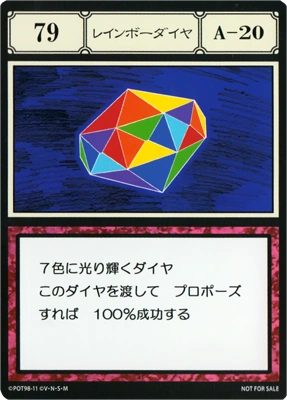 | 七色に光り輝くダイヤ。このダイヤを渡してプロポーズすれば100%成功する。手元にダイヤがある限り、2人が離れることはないだろう。 | ||||