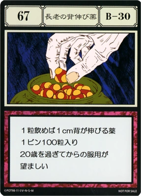 | 1粒飲めば1cm背が伸びる。1ビン100粒入り。20歳を過ぎてからの服用が望ましい。 | ||||