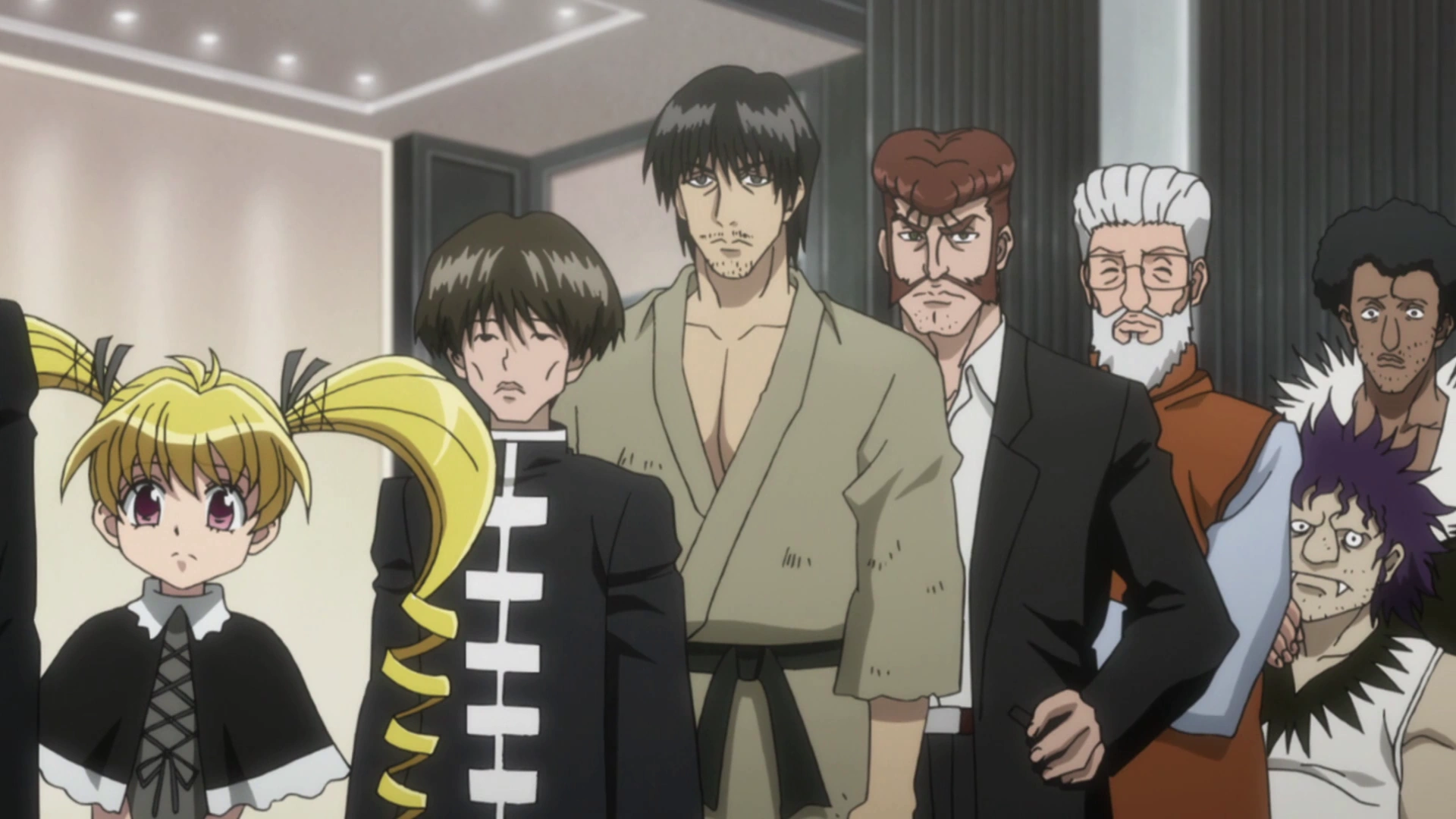 Along with five other applicants for the Nostrade Family bodyguard position, Basho waits in a room at the Nostrade's Mansion. The butler plays a video introducing the supposed boss who details the requirements for the position. The applicants are given a data card with specific items listed on it and are instructed to retrieve one of them. Basho notices Kurapika becoming pale after looking at the list, so he tries to initiate a conversation with him, going as far as to detail one of his previous employer's sickest requests, but Kurapika stops him and orders that he not talk to him. Basho then tries to open the door to leave, but finds that it's locked. The boss appears again on the screen and informs the applicants that the minimum requirement for the job is to be strong enough to make it out alive. Eleven hooded assailants wielding guns and swords suddenly charge through the door and start attacking the applicants.[5]