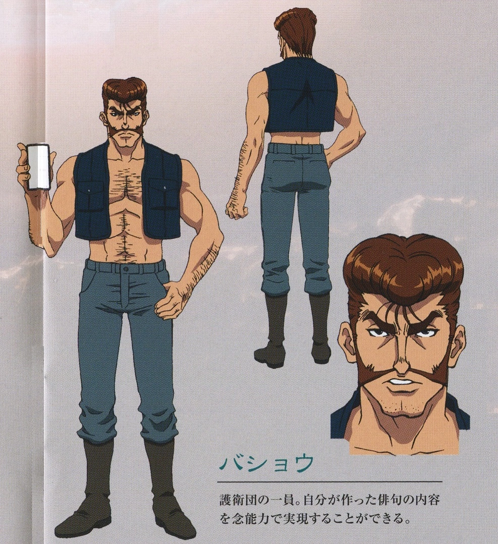 Normally wearing a small vest, pants, and tall boots, Basho is very muscular with prominent abdominal muscles and a hairy chest. He has thick eyebrows and a cleft chin, also sporting a pompadour, mustache, and sideburns. As a Royal Bodyguard, he dresses in a black suit and tie.[4]