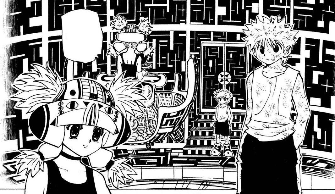 As the two boys happily chat about their abilities, Biscuit says to herself that they make a perfect team and tells them that they will end training for the day to celebrate, reminding them that it's almost New Year's Eve in the real world. Gon suddenly remembers that the Hunter Exam is soon and that Killua needs to apply. Biscuit tells them that the current date is December 29 and the application deadline is December 31. Gon wonders how Killua is supposed to leave the game, and Killua says that the members of the alliance mentioned having to do a certain task somewhere, but he also remembers that a certain spell card will let him leave.