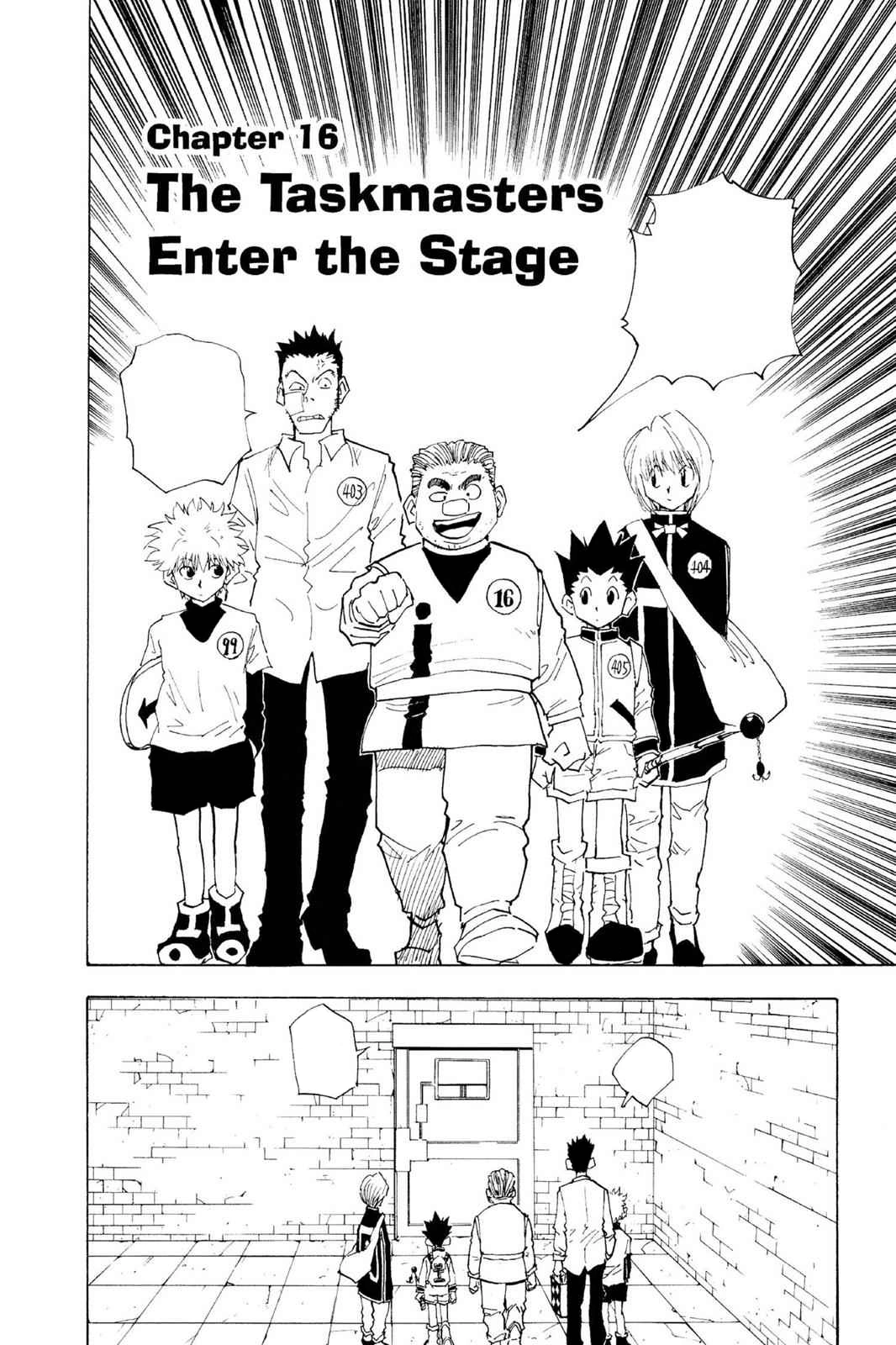 After the restraints fall to the floor and the man removes the shroud from his head, he addresses the examinees and explains that the committee has chosen them as their taskmasters, adding that the five of them will challenge the five prisoners. He continues by saying that the fights will be one-on-one and they can only fight once, telling them to choose their order and adding that they will pass if they win a majority of the matches. The prisoner also reveals that they can fight however they want and that there will be no draws, with the winner being declared once an opponent admits defeat. He tells the examinees to vote on whether they want to compete or not, and while Leorio can't believe that they have to vote again, he tells the group that they should make sure the vote is unanimous, glaring at Tonpa who quickly agrees with his assessment.