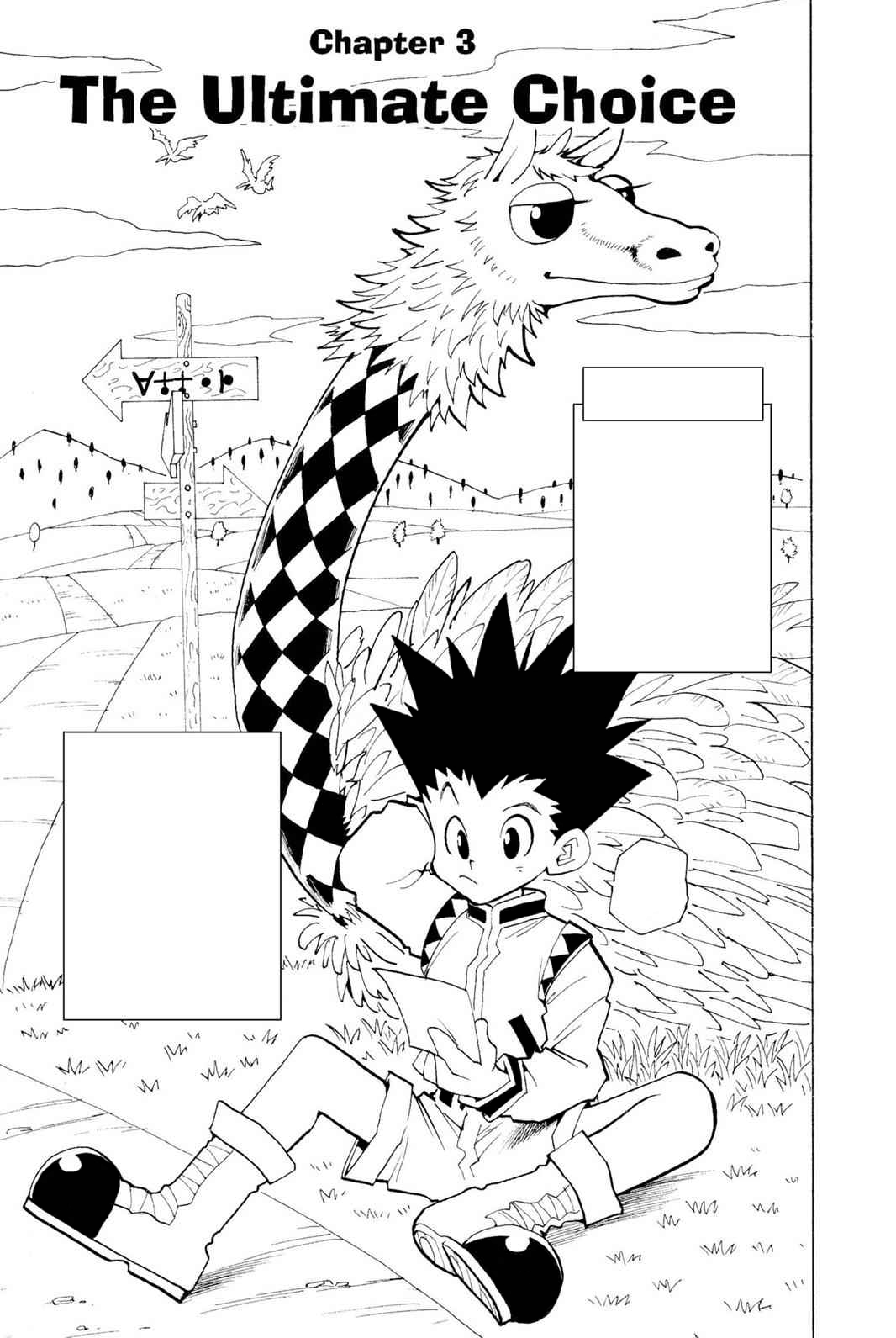 After the woman adds that they must answer with either #1 or #2, Leorio realizes that they only get one question between the three of them, but Gon points out that they can work together to answer. The applicant, who was eavesdropping on Gon and the captain back at Dolle Harbor, suddenly appears, asking if he can take the test and revealing to Gon that he listened in on his conversation. Leorio realizes that they can see what the woman's questions are like if they let the other applicant go first. After thanking them out loud, the man calls them stupid internally and plans to set up traps on the path ahead. The woman then tells the applicant that criminals have taken his mother and true love captive, asking which of the two he would save. Kurapika is left confused since the question is purely subjective, wondering if they have to guess which answer she prefers.