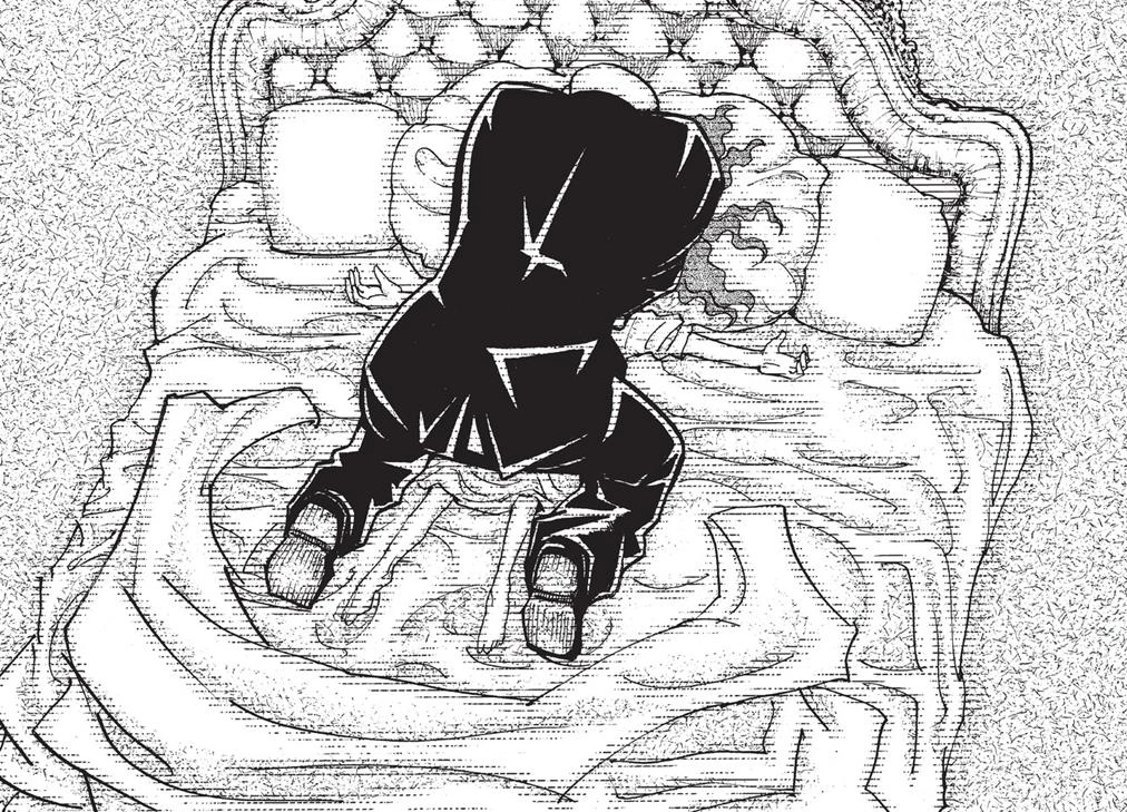 Hanzo laments over his failure to protect Momoze, and Biscuit comforts him. Hanzo deduces that the culprit used a clone to commit the murder, and arresting the 6 guards would only help vindicate them should another murder happen. Hanzo goes on to say that the murderer likely had to focus all their attention on the clone, and Biscuit continues the logic by saying it had to be an off-duty guard. Hanzo vows to avenge Momoze and catch the criminal. In Tserriednich's quarters, the Prince asks Theta about the amount of time required to learn Nen, referencing a message he heard from Zhang Lei stating that Nen could be taught in 2 weeks. He threatens her to tell the truth about the time needed to learn Nen. Theta responds that while it is possible, it is hazardous, and her method is the best. Tserriednich's Guardian Spirit Beast comes threateningly close to Theta as she promises that she is telling him the truth. Blood spatter then comes onto the ground.