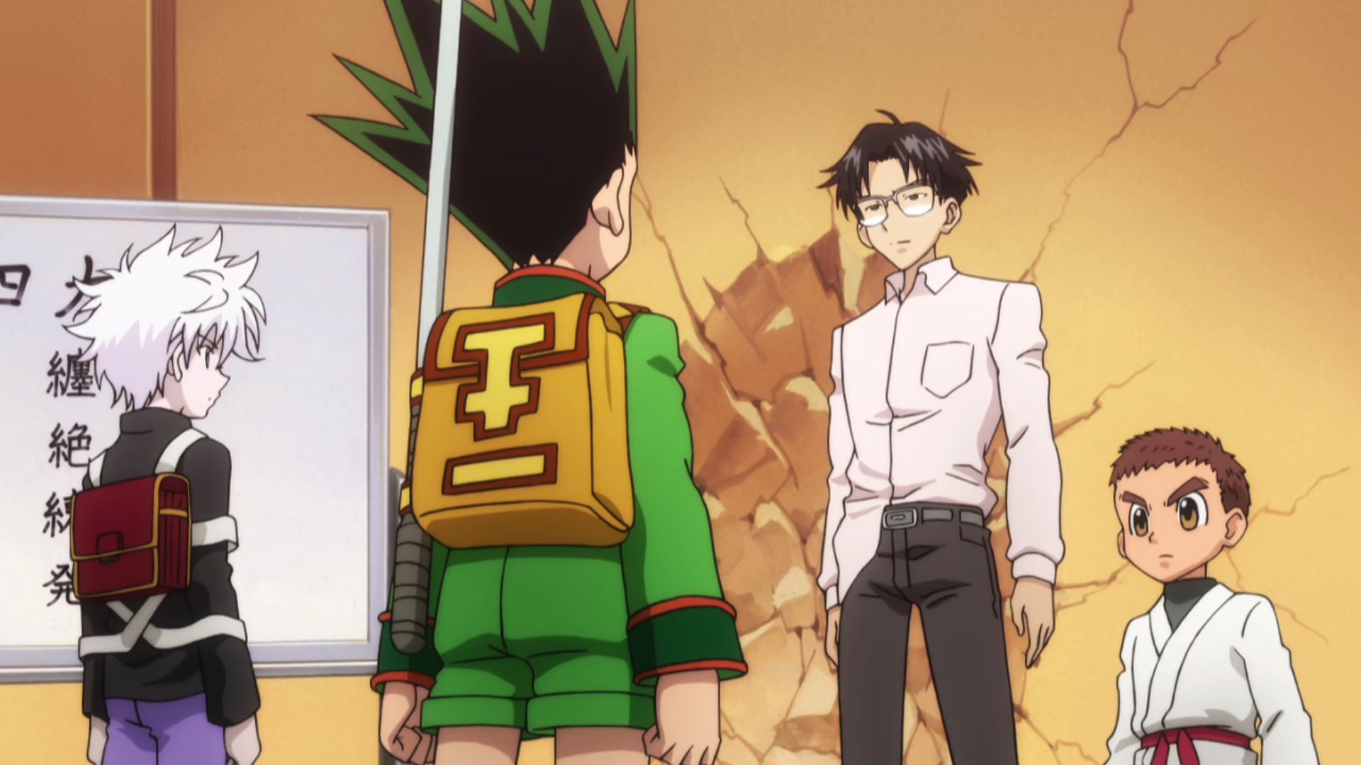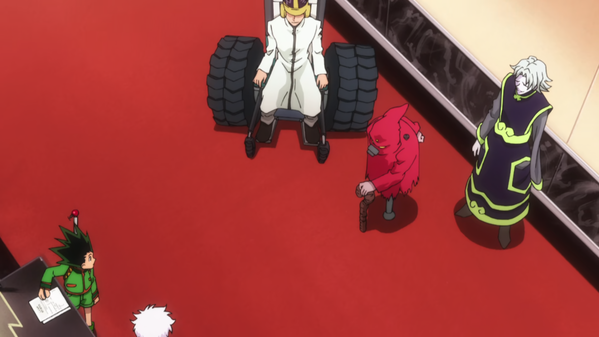 As Gon fills out the necessary form, the three fighters approach the two boys and reveal that they are simply waiting to register. Killua realizes that they want to fight on the same day as Gon, who tells the clerk that he is prepared to fight on any day. The three fighters chuckle and remain confident before the clerk gives Gon and Killua their room numbers and promises to let them know on which day they will fight. As the two leave to go to their rooms, Killua glances back at the three fighters and guesses that they must have endured the initiation that Wing mentioned, realizing that they could have ended up like them if they hadn't learned about Nen first. Gon, however, is more focused on how nice his room is, with both happily taking in a view of the city at night.