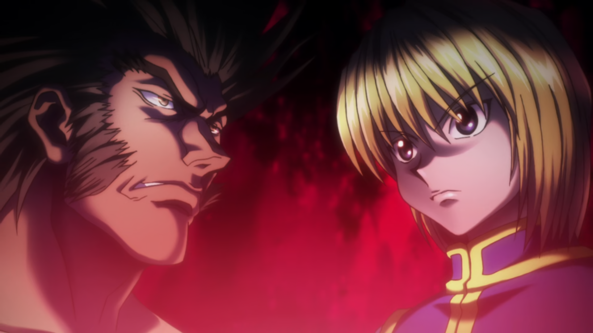 Meanwhile, Gon, Killua, and Leorio discuss their money situation in buying Greed Island. They continue their arm wrestling scam when a Mafia boss tells them about an underground fighting ring where they can make much more money. Just as Gon is about to enter a fight, it is canceled because the Mafia wants everyone to look for the Phantom Troupe members. There are incredibly huge rewards for them dead or alive. They call Kurapika to tell him about the bounty on the Troupe, but he doesn't answer. He stands face to face with Uvogin.