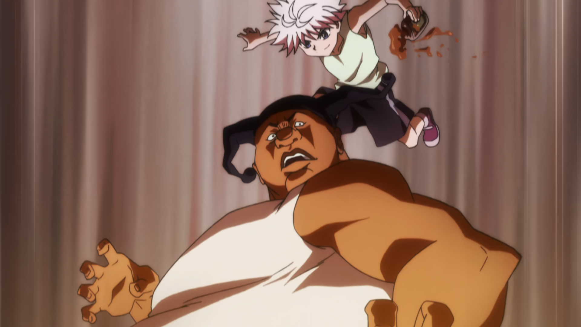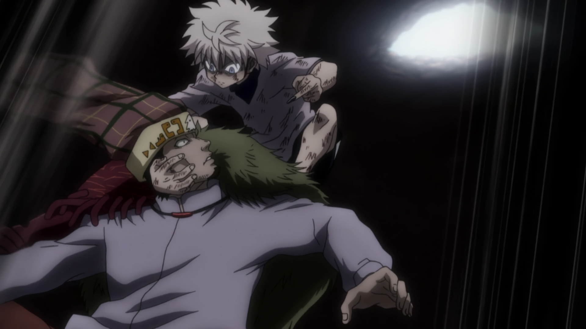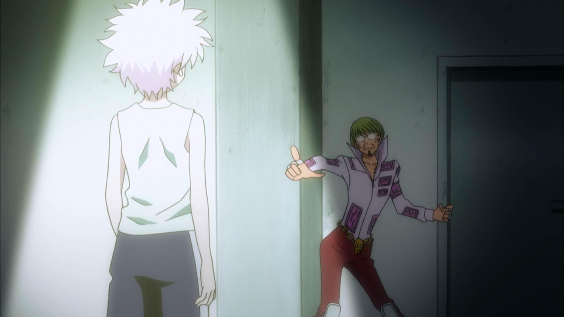 Seeing Killua is their last chance, Leorio despairs, to the boy's irritation. Leorio's attitude changes when he recognizes his adversary as the serial killer Johness the Dissector. His criminal record piques Killua's interest, who steps forward. As soon as Johness consents to a deathmatch, Killua plucks out his heart in an instant, smiling at him and crushing it in front of his eyes. The five applicants are declared victorious, and Killua invites Bendot to fight to pass the time, an offer the convict fearfully declines. The examinees are forced to spend the next 50 hours inside a locked room, where Kurapika questions Killua about his feat. Killua responds he modified his hand to make it easier, and that he used to be a pro, whereas Johness was an amateur.[34]