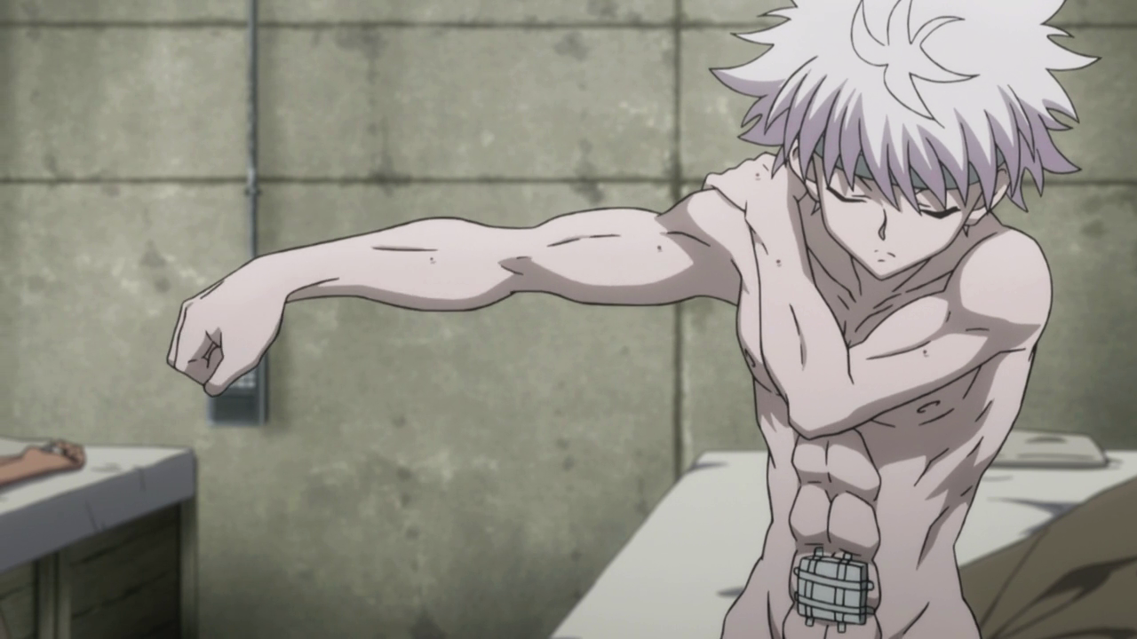 When he arrives in front of the Testing Gate, he opens it up to the third door, weighing 16 tons.[44] He lets himself be tortured by his brother Milluki for three weeks, until he tells him Gon, Kurapika and Leorio are awaiting him at the butlers' quarters and threatens to have them kill the three. Killua snaps one of his handcuffs and threatens Milluki back. Zeno arrives and tells Killua that he is free to go and that his father would like to speak with him.[12]