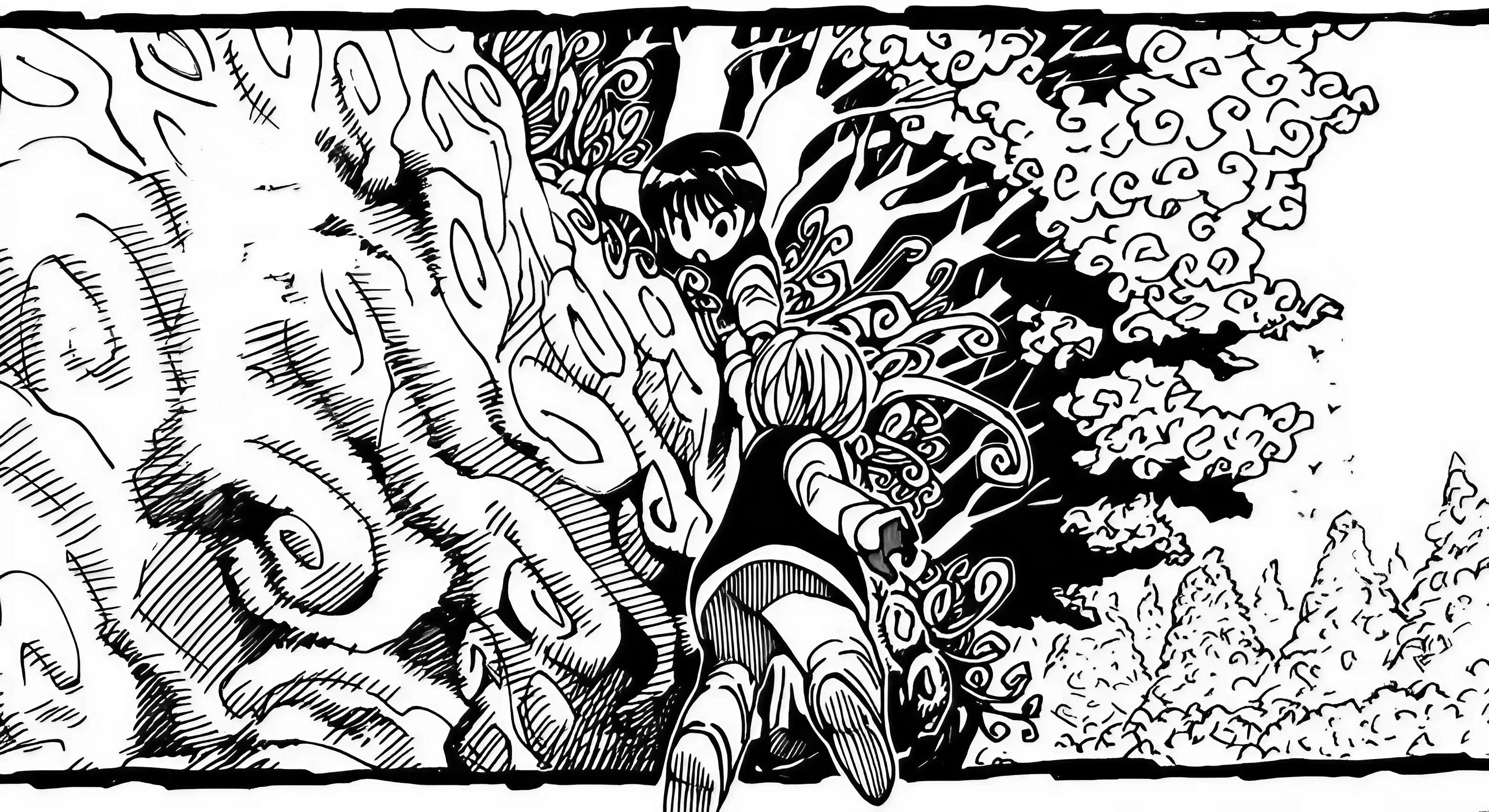 The next day, September 4th, Kurapika meets up with Gon, Killua,[70] and Leorio again. He tells them about the secrets of his Nen abilities and his connection with Hisoka, knowing that they are true friends. Now that Gon and Killua have learned of his abilities, they realize the threat Pakunoda poses.[71] He then receives a message from Hisoka saying that the bodies are fakes.[72] Kurapika decides to keep chasing after the Phantom Troupe alone, but Leorio, Killua, and Gon want to help him.[73]