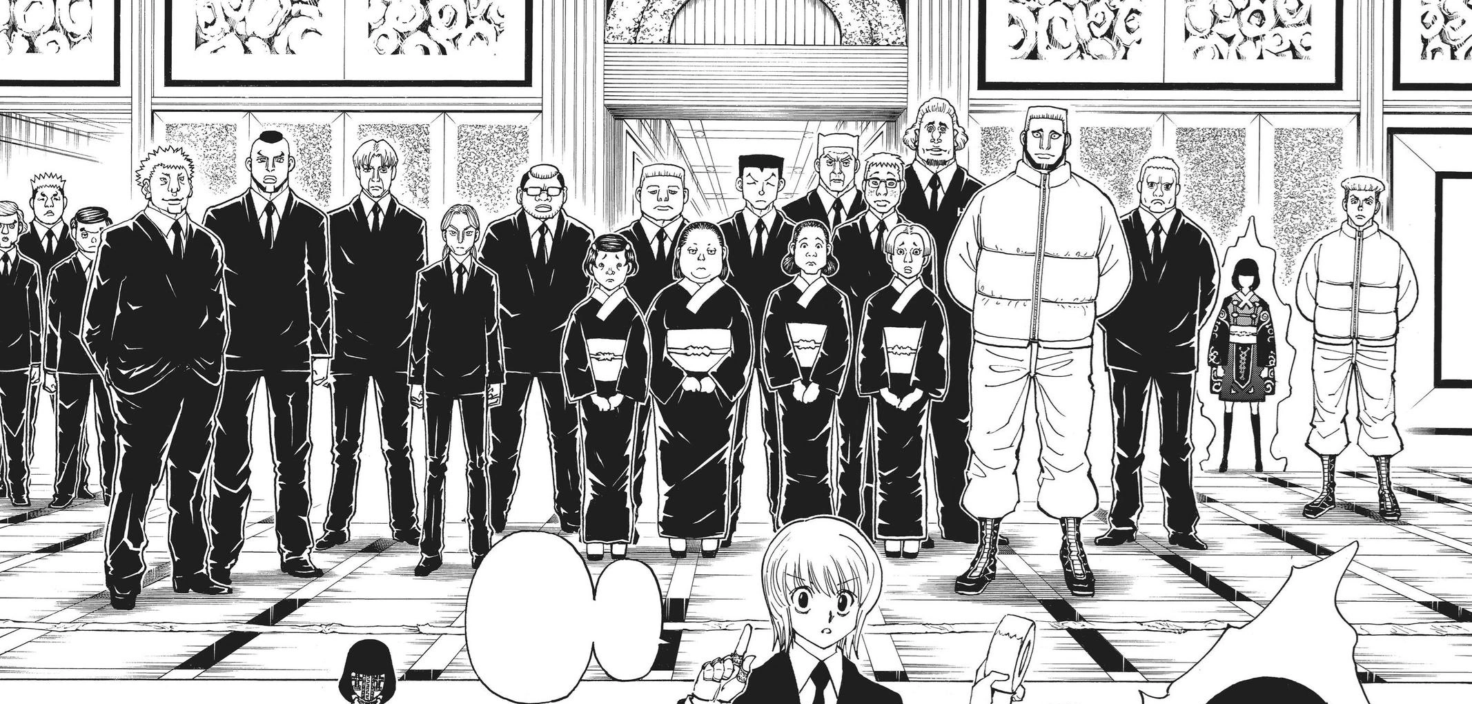 Kurapika learns Nen in six months and looks for a customer who has strong connections with the auction in Yorknew City. At the beginning of August, he appears at the mansion of a collector who collects body parts to apply for a job as a bodyguard. In the mansion he meets five other people, three of them Hunters themselves: Melody, Baise, Shachmono Tocino, Basho, and Squala. A man shows up on the screen in the hall where they are waiting and tells them that if they want the job, they at least have to get out of the mansion alive. As he finishes, a group of 11 people who wear black hooded robes and masks and are armed with guns and swords suddenly appear and attack them.[44] Using his Dowsing Chain, Kurapika blocks a number of bullets fired at him and jumps onto a chandelier to avoid the sword users and observe the situation.[45]