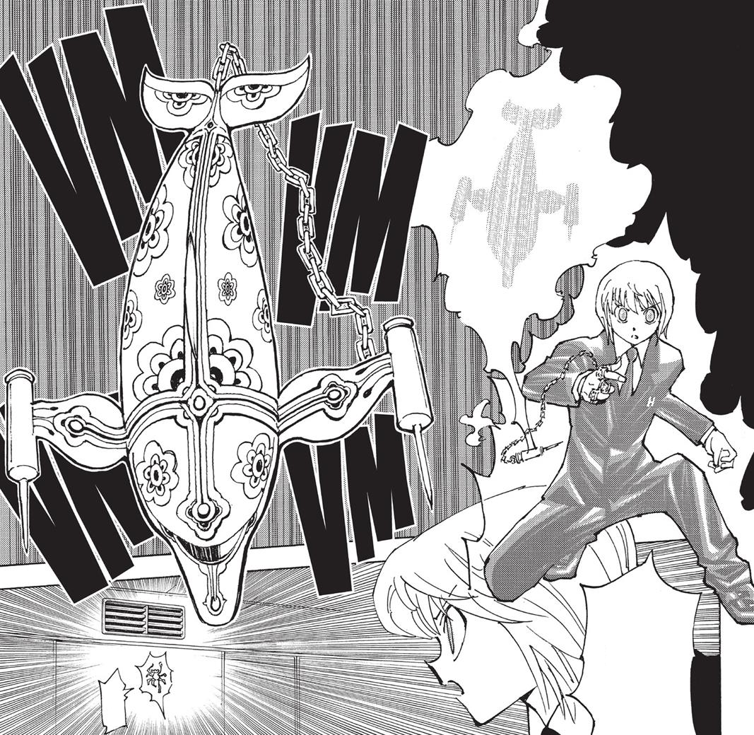 Shaped like a syringe, upon piercing the body of the target this chain drains their aura and steals one of their Nen abilities. While their aura is being drained, the target is forced into a state similar to Zetsu. The process appears to be very painful for them. The target is unable to use the stolen ability until it is returned to them. It is unknown if, aside from piercing the target with the chain, Kurapika must fulfill other conditions: thus far, he has stolen two abilities, one after the owner's Nen type had been revealed and the general mechanics of the ability explained,[94] and another that was about to be used without any prior knowledge. The death of the original owner does not result in Kurapika losing possession of a stolen ability.[97] | |||||
