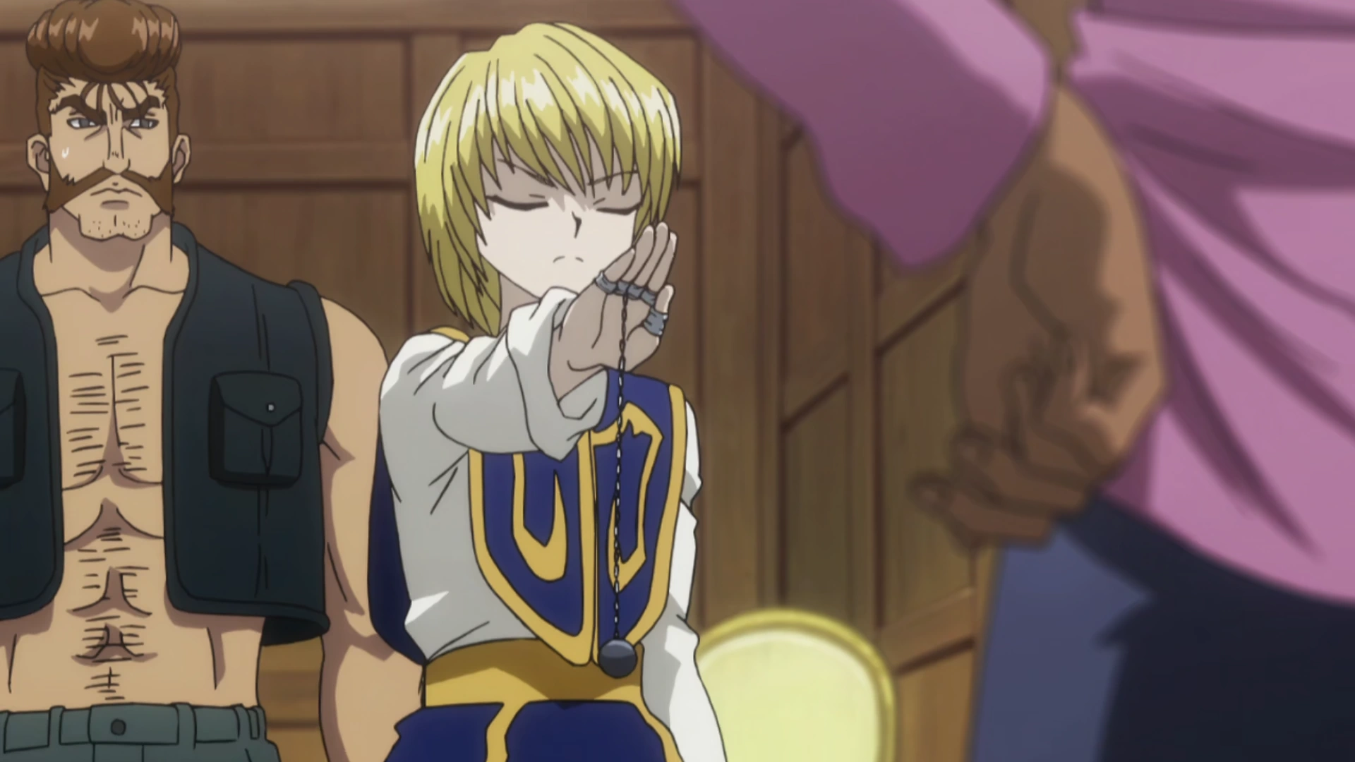 After explaining its purpose, he points Ladiolus as his most advanced disciple to provoke some of the other bodyguards into being competitive. He states that one's Nen category should never be revealed and that the screenings will be conducted in a separate room and witnessed only by Bill and him. When Maor, Satobi, and Danjin object, Kurapika justifies his decision with the requirements of the training, the risk he took by showing his own Nen type, and his camp's wish for a stalemate, which means that he has no intention of gathering intelligence to hurt the higher-ranked princes. Once again, he adds that if they cannot accept his conditions, they can drop off the training.[110] One by one, Kurapika invites Ladiolus, Maor, Yuri, and Satobi into the main bedroom. There, contrary to what he told them, he does not have them perform Water Divination, but, after receiving their consent, he forces their Aura Nodes open with Stealth Dolphin and briefly gives them Bill's Erigeron ability. He then enforces a gag order preventing anyone from disclosing what transpired until every one of his students has, supposedly, taken the test, lest the training be canceled.[111]