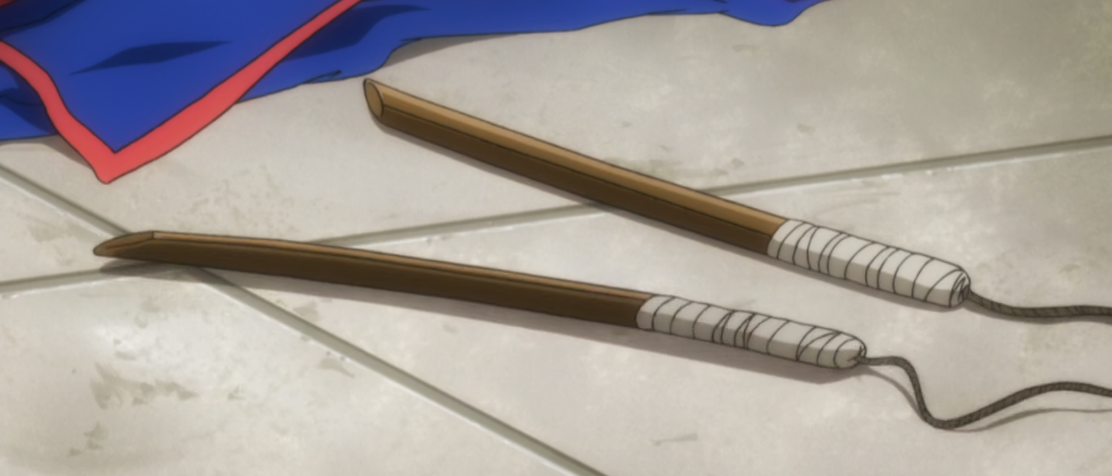 Bokken: During the Hunter Exam, Kurapika wielded two wakizashi-sized bokken as his weapon of choice. The handles of his two bokken are wrapped in bandages and linked together by a thread, which allows Kurapika to wield them as a nunchaku. In the 1999 anime adaptation, the bokken are revealed to actually be sheathed swords.
