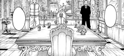 Kurapika relays his impressions to Hanzo and asks him to stay in Room 1013. He warns the ninja that Vergei might suspect the presence of a mole in their midst since he did not inquire about his sources. When Hanzo asks him what he ought to do next, Kurapika tells him to prioritize finding information on how to ensure Prince Marayam's safety. When Hanzo leaves, with Babimyna's consent, Kurapika answers Sakata's questions about Room 1013, adding that he suspects the Nen beast of the Thirteenth Prince to be involved. Meanwhile, he wonders about Babimyna's conduct.[107]
