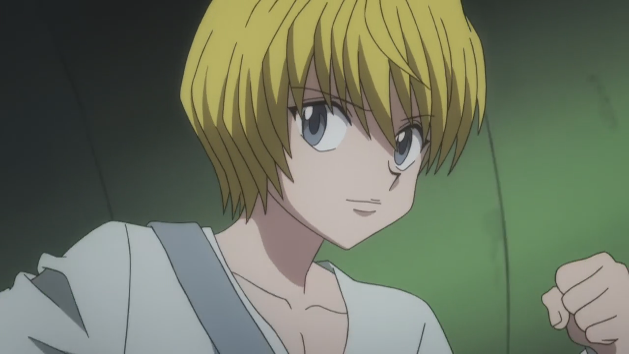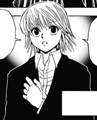 Kurapika makes his first appearance onboard a ship that goes from Whale Island to a testing site of the 287th Hunter Exam. He, Gon, and Leorio are the only 3 candidates unaffected by a storm the night before. When the Captain announces an even fiercer one is approaching, the three are the only candidates not to leave the boat. He initially refuses to answer the Captain's question about his motives, but when he reveals that he is an examiner Kurapika replies that he is the last of the Kurta and wants to capture the Phantom Troupe. When Leorio objects he does not need to become a Hunter to do so, Kurapika condescendingly explains a license facilitates the acquisition of information. When Leorio answers the Captain that he is attracted by the material possessions provided by being a Hunter, Kurapika remarks that money cannot buy class. The two quarrel over their different opinions and decide to end it with a fight out on the deck while another storm is raging. When they are about to start, a crew member is knocked off the deck by a piece of wood broken off from a yard. Leorio immediately rushes to help him, followed shortly by Kurapika, but they fail to catch him. Gon jumps overboard and grabs him, while the two catch him by his legs. They both reprimand Gon for his recklessness, then apologize to and makeup with each other. Seeing that, the captain laughs and decides to take the trio to the port nearest the exam hall, Zaban City's.[6]