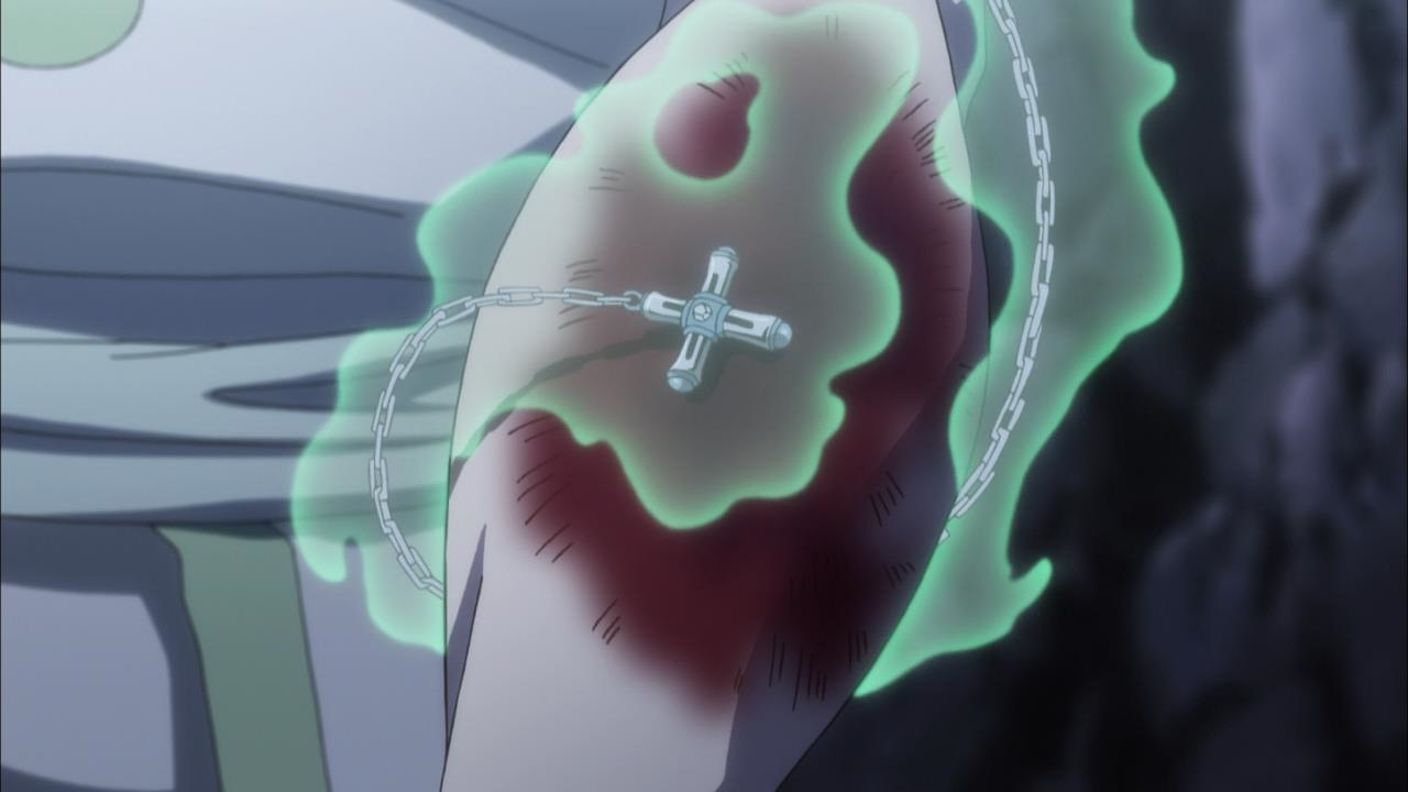 Shaped like a cross, it cures wounds by drawing from Enhancement abilities. When Kurapika is in his Specialist state, it can heal serious injuries, such as a fractured arm, within seconds.[59] | |||||