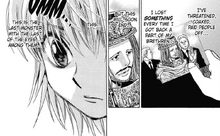 Noticing that Tocino is the only person who is not being attacked, he jumps down, puts a knife at Tocino's throat, and orders him to stop the attackers in three seconds. Tocino obeys by making the Eleven Black Children disappear and tells them that he is a Hunter ordered by the owner of the mansion to test them and that they can get out of the mansion now. Kurapika suspects that he is trying to confuse them. Using his Dowsing Chain again, he discovers that Squala is another infiltrator, which is further confirmed by Melody's, Baise's, and Basho's techniques. He and 3 other genuine applicants thus pass the test.[45]