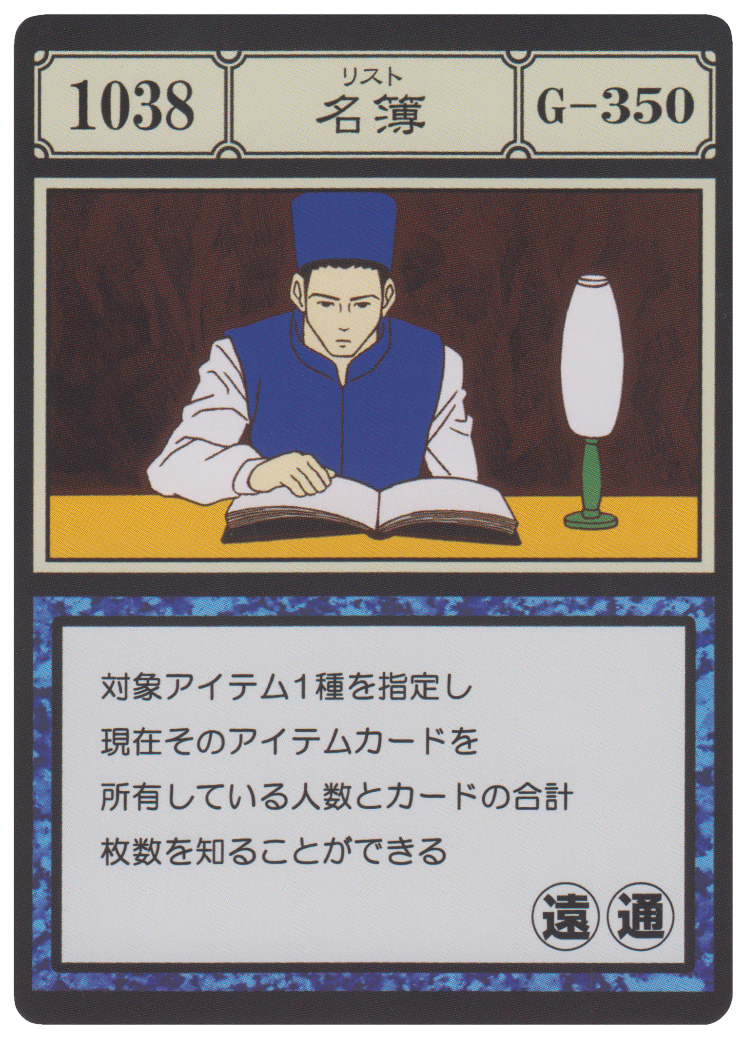 | [Jap] | No.1038 :: 名簿 対象アイテムを1種指定し、現在そのアイテムカードを所有している人数とカードの合計枚数を知ることができる。 |
