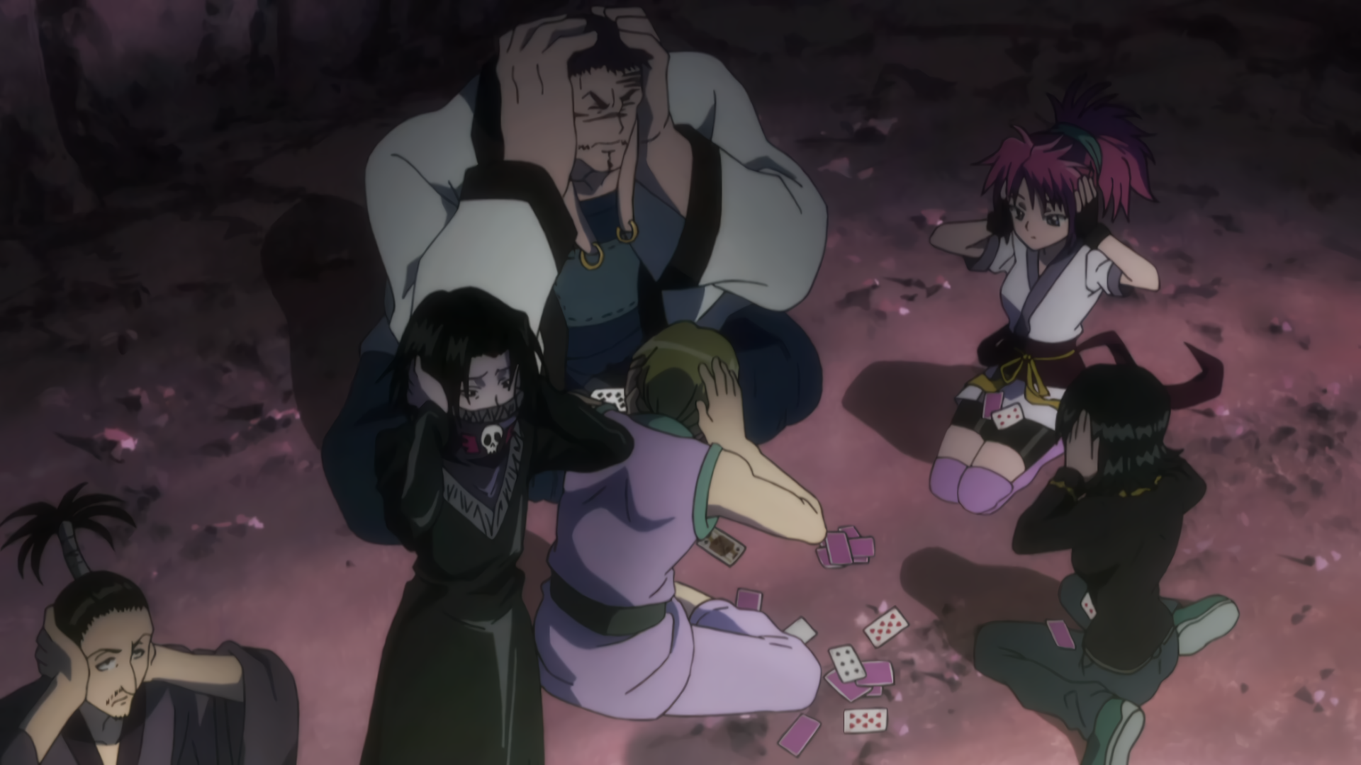 On the seventh day of the voyage, after Phinks, Nobunaga, and Feitan discuss the current situation with Cha-R superiors Ken'i and Tajao, Phinks asks them to verify Heil-Ly boss Morena's location while they contact the other Troupe members to hunt down the hit man attacking the Cha-R.[48]