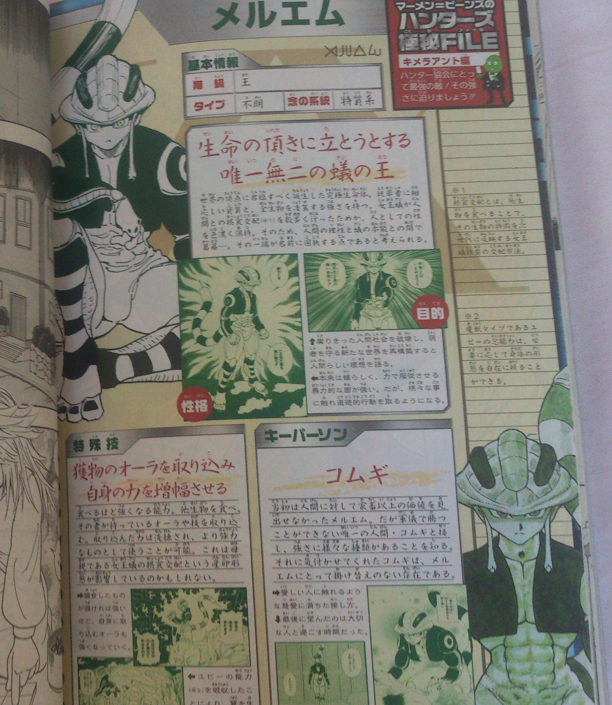 Meruem (メルエム, Meruemu) was the most powerful offspring of the Chimera Ant Queen. He was known as the "King" (王, Ō) of the Chimera Ants,[2] and served as the main antagonist of the Chimera Ant arc.