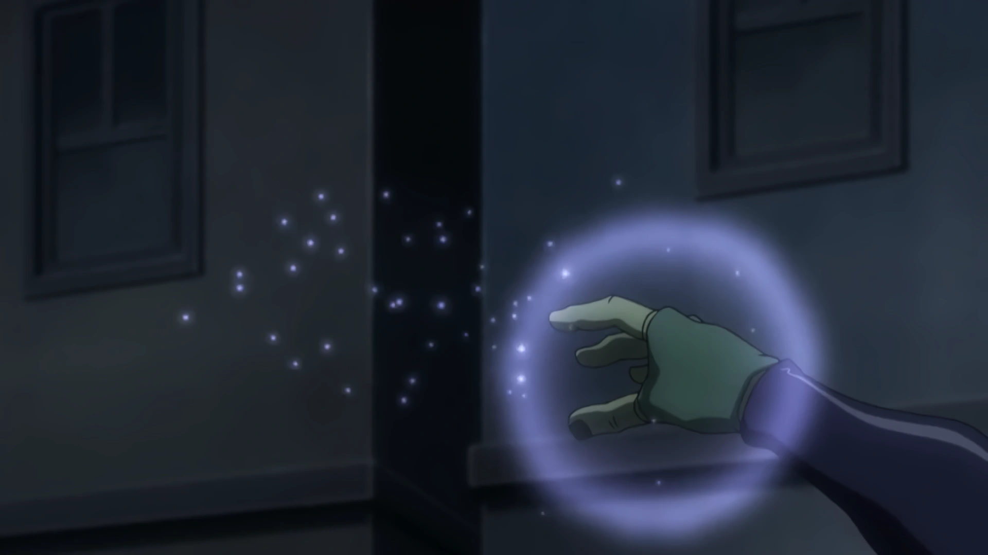 The first time he used En, it covered an area much wider than the palace grounds and spread at the speed of light.[44] Despite its vastness, his control over it is so refined that he was able to discern changes in the environment as small as fresh footprints.[46] At first, unbeknownst to him, his En transmutes part of his aura into photons that relay information to him. When, after only two uses, he became aware of this trait of his En, he was able to turn it into a Nen ability.[48] The absorption of Shaiapouf and Menthuthuyoupi endowed him with variations of their Nen abilities, which he could activate successfully on the first try.[40][41][46]