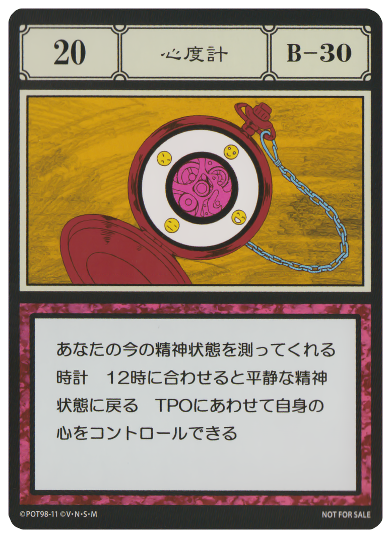 | [Jap] | No.020 - 心度計 あなたの今の精神状態を測ってくれる時計。12時に合わせると平静な精神状態に戻る。TPOにあわせて自身の心をコントロールできる。 |
