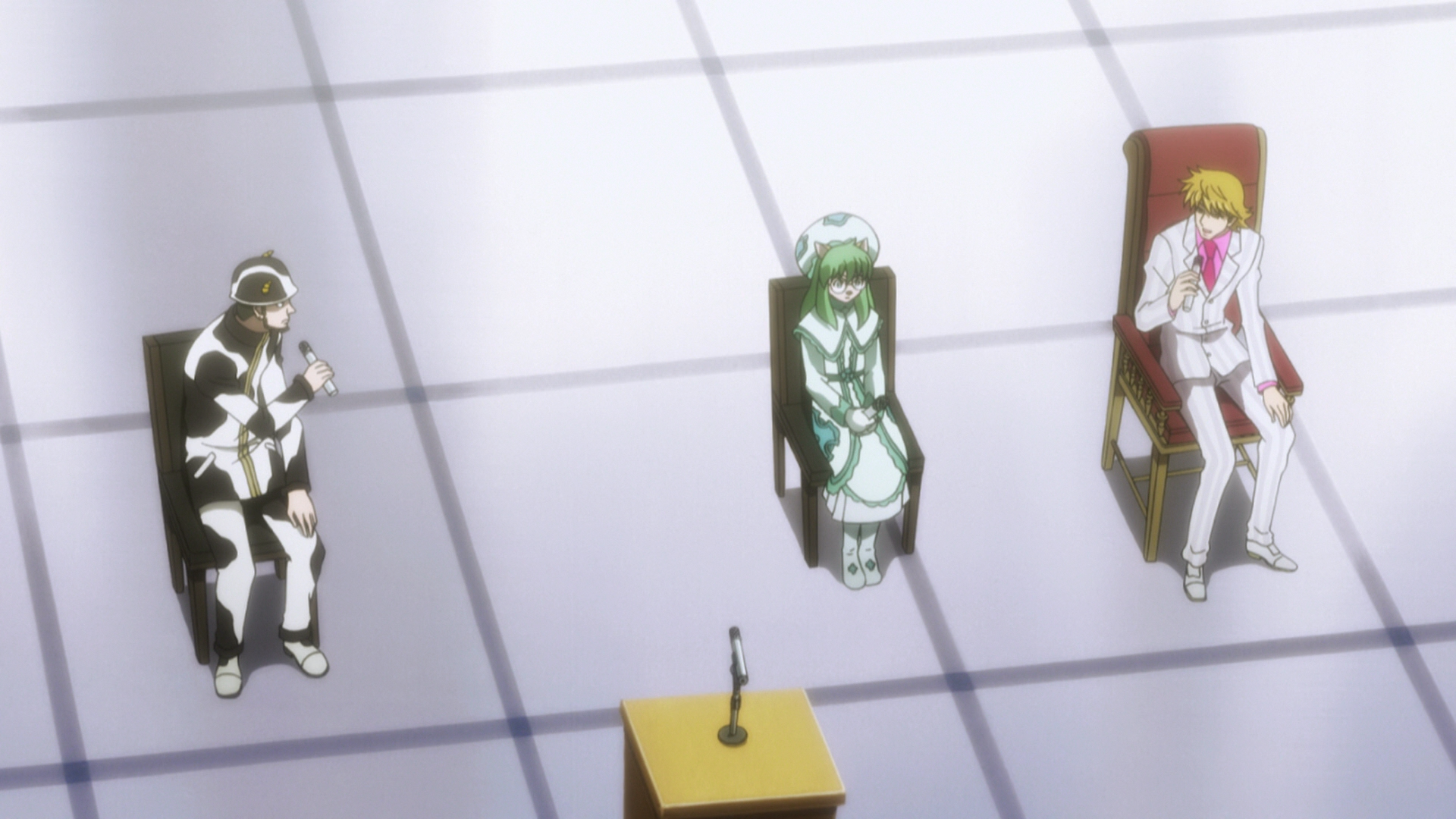 In the third round, Pariston receives 258 votes, but since there's an increase in absentees, it's decided that these Hunters will have their licenses confiscated for breaking the rules. Seeing this, Pariston wonders if it's truly enough to just confiscate the Hunter Licenses, so he makes a suggestion that the Zodiacs hold a lecture with all the Hunters to show them how important the election is.[9] As Pariston is making his speech to all the Hunters, trying to convince them to vote, asking that if anyone has anything on their mind to stand and speak their mind and that minority groups will not be looked down upon, Leorio picks up a microphone and speaks his mind. In the fourth round, Pariston receives 258 votes again.[10]