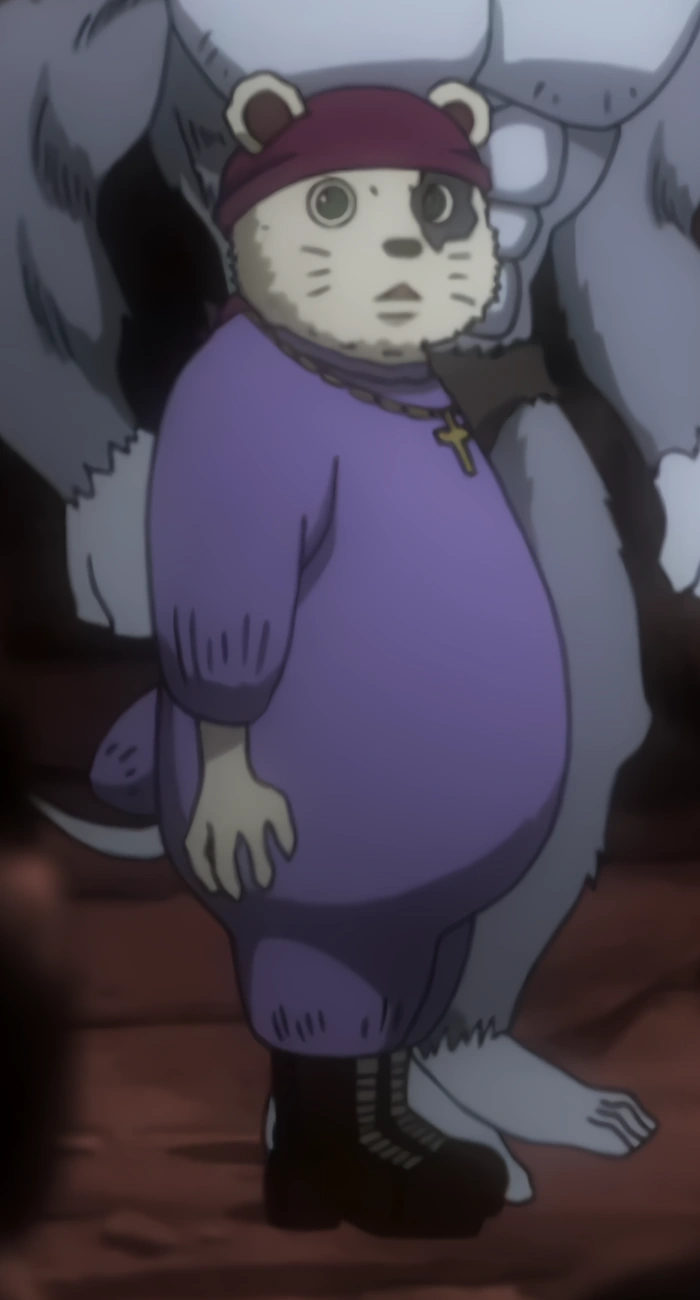 Small Bear is one of the first human-esque Chimera Ants to be born. He has the appearance of a panda with baggy clothes and a cross necklace.[1]