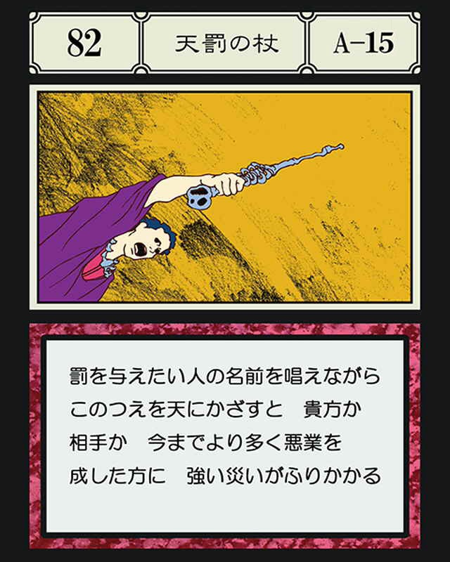 | [Jap] | No.082 :: 天罰のつえ 罰を与えたい人の名前を唱えながらこのつえを天にかざすと、貴方か相手か今までより多くの悪業をなした方に強い災いが降りかかる。 |