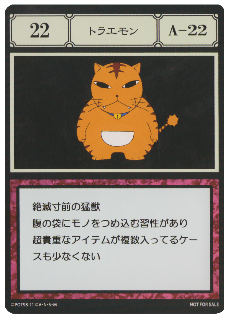 | [Jap] | No.022 - トラエモン 絶滅寸前の猛獣。腹の袋にモノをつめ込む習性があり、超貴重なアイテムが複数入っているケースも少なくない。 |