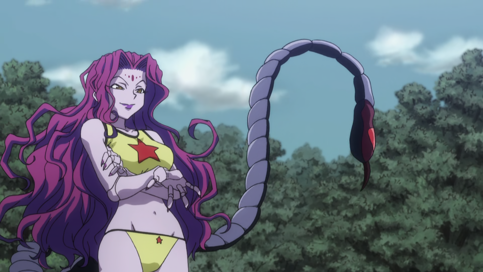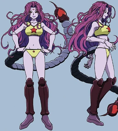 Zazan was a humanoid Chimera Ant. Like the other members of her species, she had jointed hands and legs. She had long and unkempt fuchsia hair, golden eyes, purplish skin, and a large bust. On her forehead were several raised ovals, the same color as her hair, which resembled gemstones. Her long scorpion-like tail bore a red heart in the telson. She initially wore a two-piece yellow outfit, with a red star on the top and bottom, that bared her midriff, much like a bikini. After announcing herself as queen, her outfit changed to a corset and a more revealing brassiere (which only covered the area where her nipples were), with a long skirt to hide her tail from her enemies.