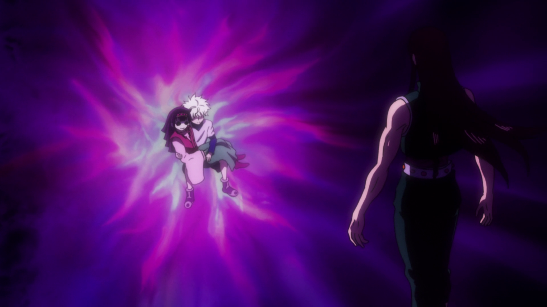 Killua finally arrives to the butler residence and greets Gon and the others. He tells them that they need to leave quickly to escape from his mother.[24]