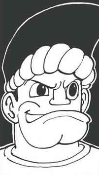 Usamen has a prominent under bite, irregular eyes, cleft chin, and a Japanese sushi chef headband.[2]